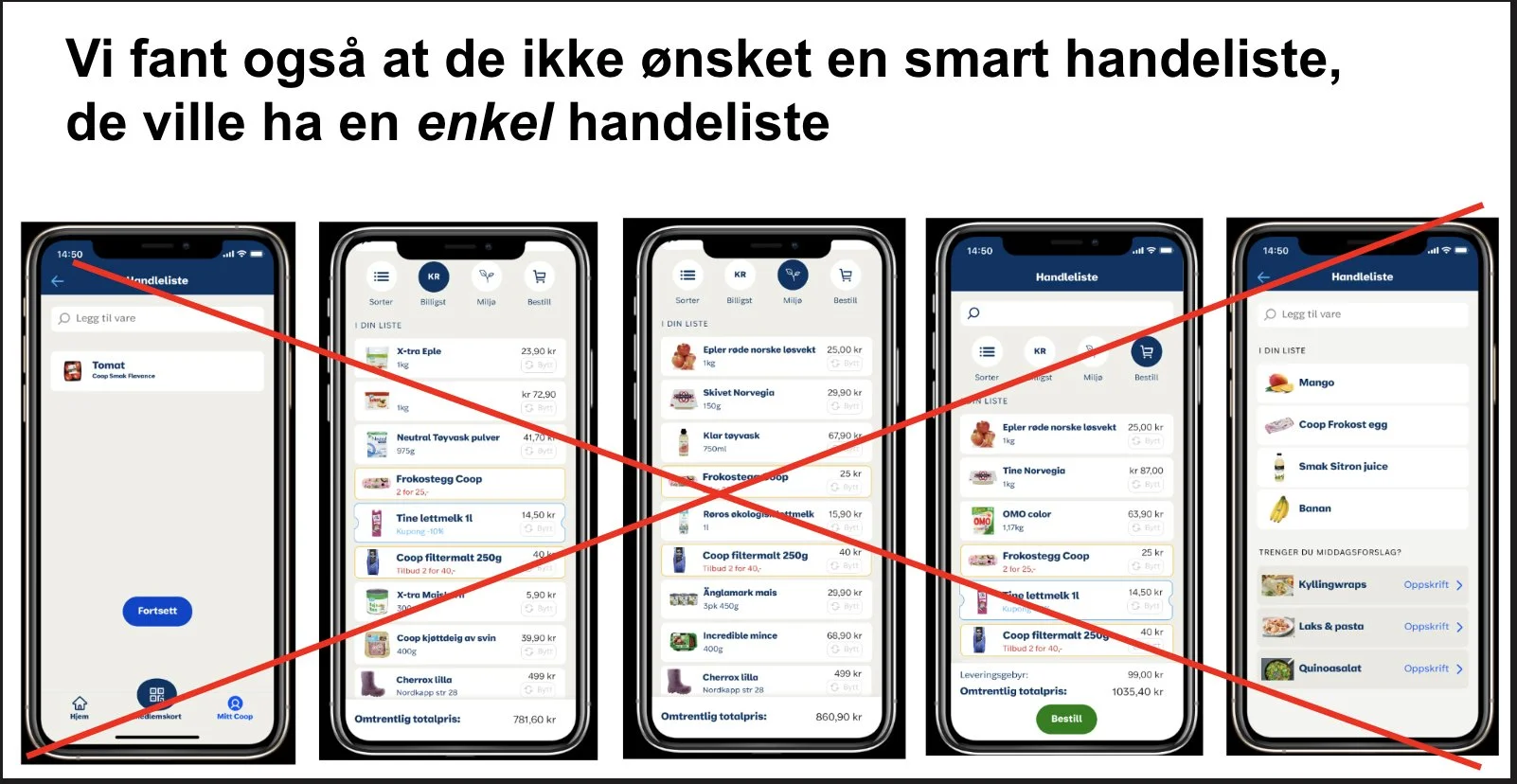Gjennom prototypetestene lærte vi blant annet at brukerne ønsket en enkel og fleksibel handleliste – de ville heller skrive inn generelle produkter som «ost» enn spesifikke merkevarer, og det var avgjørende at listen kunne deles med andre. Samtidig testet vi flere idéer som ikke hadde nok verdi for brukerne, og valgte å ikke bygge disse.
