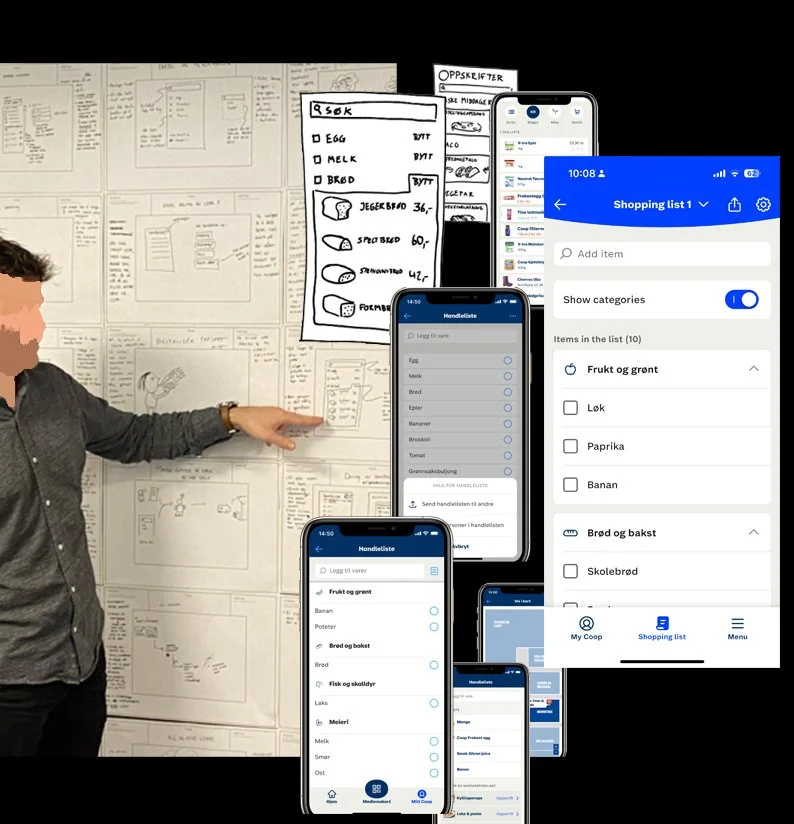 Dette er en iterativ prosess der jeg hjelper dere å idémyldre, prioritere, skisse ulike løsninger, teste løsningene, velge de som fungerer for nye skisser, teste og til slutt ha en løsning som er 80% god nok og kan bygges av utviklere.